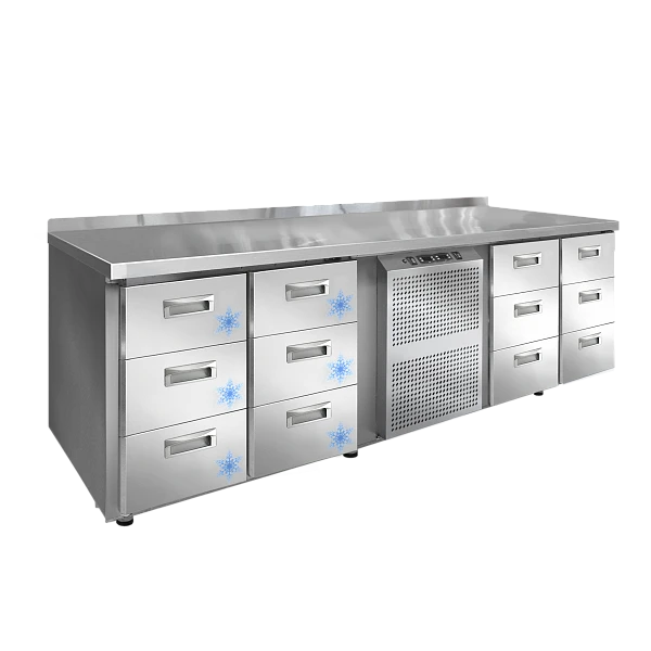 Конструкция комбинированного стола включает две рабочие камеры с независимым управлением для хранения продуктов. Одна создает температуру от -2◦С до +8◦С. Вторая – -10…-18◦С.