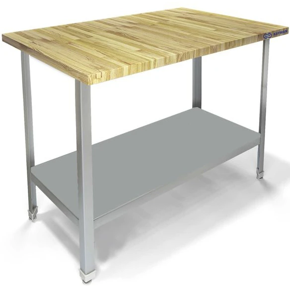 Стол кондитерский на нержавеющем каркасе из уголка AISI430, внизу полка-накладка, столешница из бука.