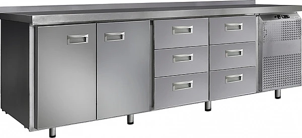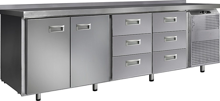 Стол морозильный Финист НХС-600-2/6 предназначен для хранения предварительно замороженных пищевых продуктов на предприятиях общественного питания и торговли. Модель оснащена расположенным сбоку агрегатным отсеком, столешницей с задним бортом, 2 холодильными камерами с распашными дверцами, 6 выдвижными ящиками, устойчивыми ножками с подпятниками, кабелем питания с евровилкой и кнопочной панелью управления с цифровым дисплеем. Цельнозаливной корпус выполнен из высококачественной нержавеющей стали.