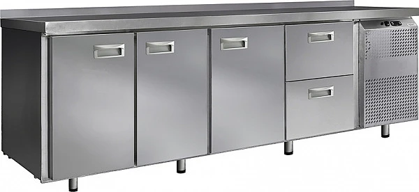 Стол морозильный Финист НХС-600-3/2 предназначен для хранения предварительно замороженных пищевых продуктов на предприятиях общественного питания и торговли. Модель оснащена расположенным сбоку агрегатным отсеком, столешницей с задним бортом, 3 холодильными камерами с распашными дверцами, 2 выдвижными ящиками, устойчивыми ножками с подпятниками, кабелем питания с евровилкой и кнопочной панелью управления с цифровым дисплеем. Цельнозаливной корпус выполнен из высококачественной нержавеющей стали.