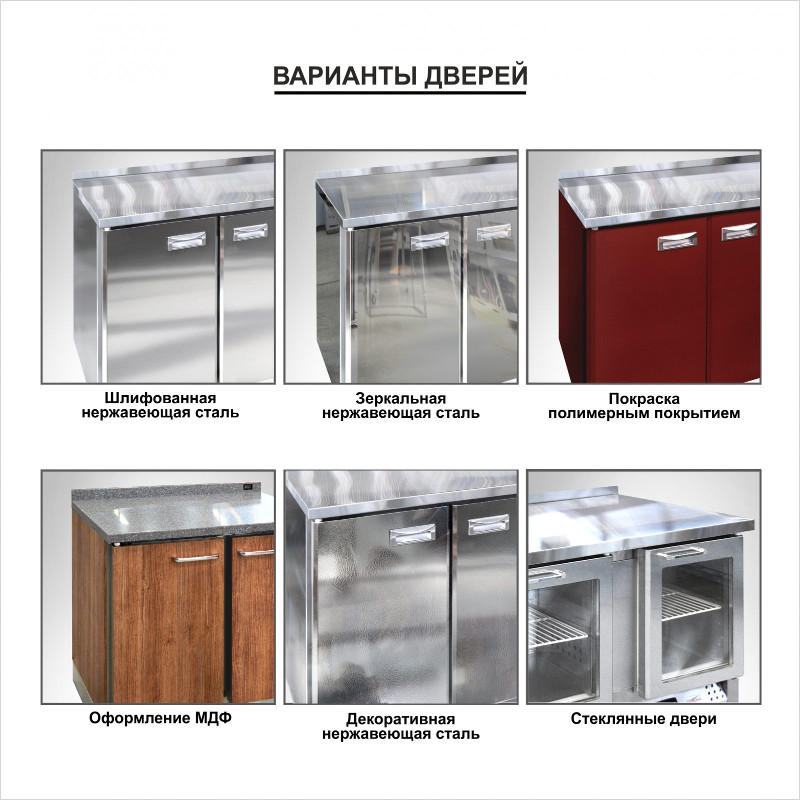 Стол имеет возможность встраивания под единую столешницу барных линий или тепловых островов. Оснащен четырьмя опорами: с лицевой стороны две ножки уменьшенной высоты, с дальней стороны два колеса, обеспечивающих повышенную мобильность для проведения уборки или монтажа. Стол полностью выполнен из высококачественной пищевой нержавеющей стали. Выпускается с распашными дверями или ящиками, которые имеют надежные петли с опцией доводчиков. Передняя панель моторного отсека имеет большую площадь перфорации, что позволяет обеспечить холодильному агрегату поступление воздуха для охлаждения.