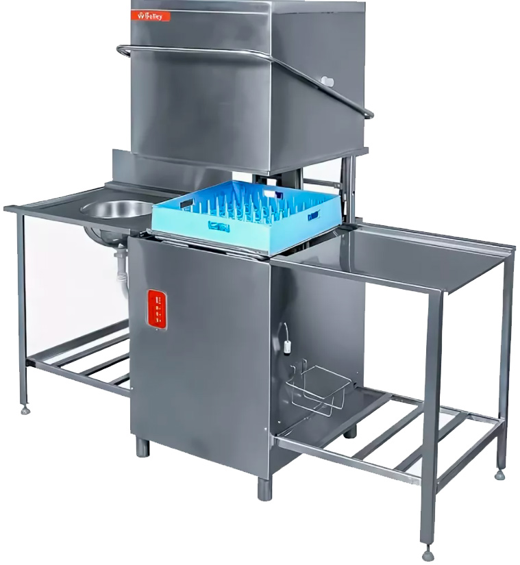 Стол имеет мойку в виде воронки для предварительного ополаскивания посуды, сборник для остатков пищи и полку под кассеты.