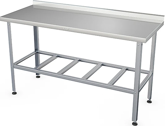 Наличие борта позволяет располагать стол вдоль стены, исключая попадание остатков обрабатываемой продукции на пол, что значительно упрощает уборку помещения