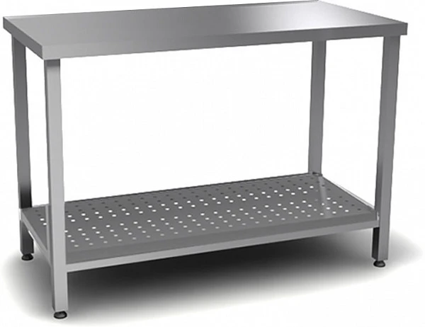 Стол производственный с перфорированной полкой для разделки и обработки пищевых продуктов изготовлен полностью из нержавеющей стали, ножки изготовлены из стального трубы 40х40мм.