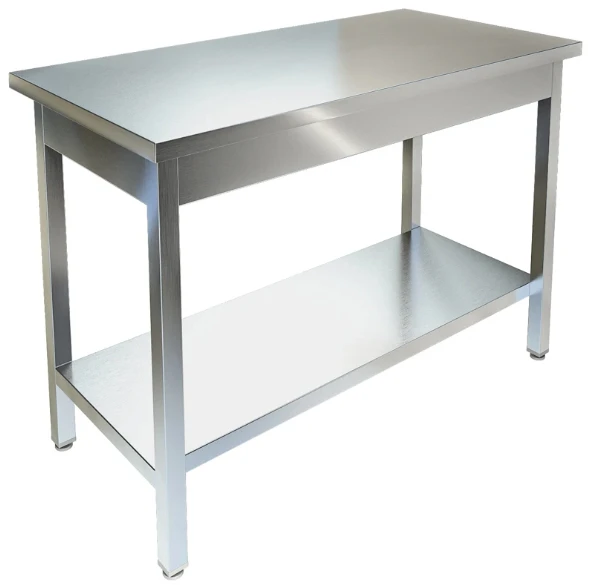 Стол производственный без борта, столешница из нержавеющей стали марки AISI 304 толщиной 0,8мм. Каркас разборный из уголка 40х40 нержавеющей стали марки AISI 430 толщиной 2мм. Сплошная полка-накладка из нержавеющей стали марки AISI 430 толщиной 0,8мм. Регулируемые опоры.