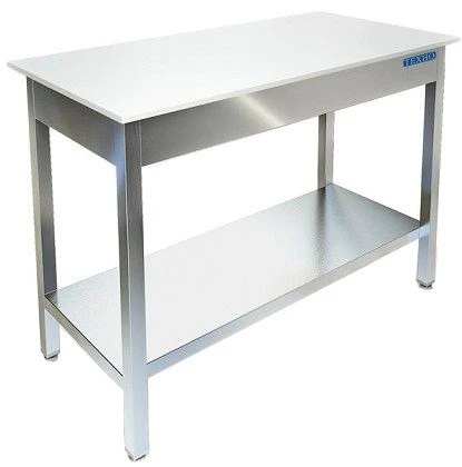 Столы могут устанавливаться в центре кухонного помещения для четырехстороннего доступа к рабочей поверхности или к стене. Ножки стола снабжены регуляторами высоты, что позволяет устранять неровности пола. Универсальная конструкция позволяет легко производить сборку стола. Изделие легко моется. Стол имеет столешницу из полипропилена толщиной 20 мм. Каркас изготовлен из конструкционного профиля нержавеющей стали, внизу полка.