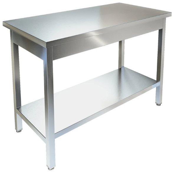 Стол производственный без борта, столешница из нержавеющей стали марки AISI 430 толщиной 0,8мм. Каркас разборный из уголка 40х40 нержавеющей стали марки AISI 430 толщиной 2мм. Сплошная полка-накладка из нержавеющей стали марки AISI 430 толщиной 0,8мм. Регулируемые опоры.