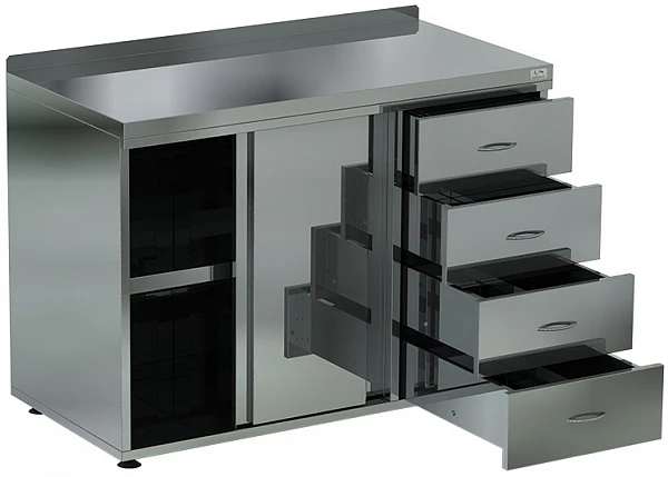 Стол-тумба полностью изготовлена из нержавеющей стали aisi 430, что позволяет их применять в различных цехах.