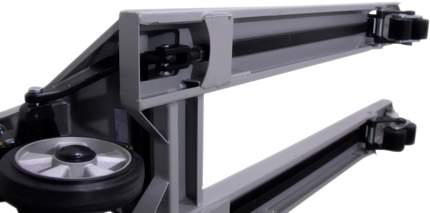 - Клиновидная форма и дополнительный ролик на концах вил обеспечивают легких ввод и вывод гидравлической тележки при работе с грузовыми паллетами.