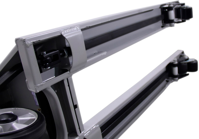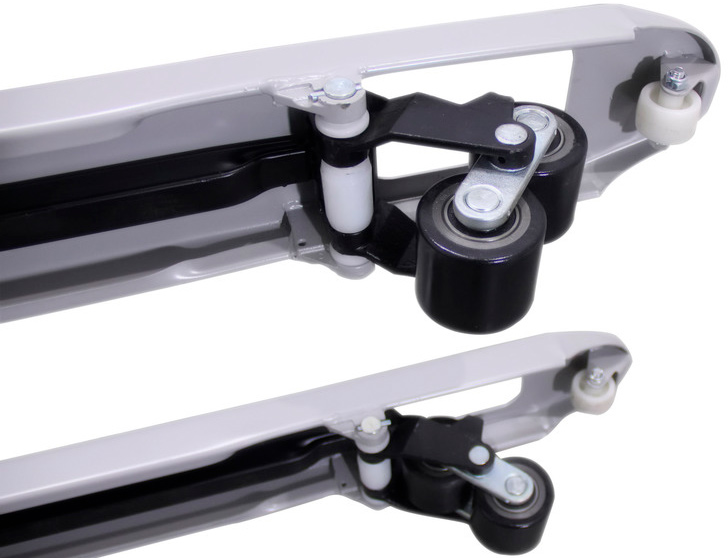- Для более плавного преодоления препятствий и компенсации неровностей пола на тележке устанавливается специальная плавающая каретка с двойными полиуретановыми роликами нагрузки (тип TANDEM).