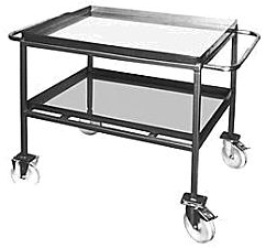 Тележка снабжена ручками, имеет прочную конструкцию из крашеного металла, установленную на колесные опоры: фиксированные и поворотные.