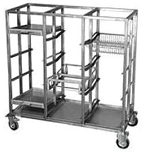 Тележка имеет 4 уровня, укомплектованных сетками для тарелок глубоких и мелких, поддонами из н/стали для столовых приборов.