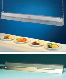 Подогреватель подвесной для кратковременного поддержания в разогретом состоянии сервированных горячих блюд, готовой пиццы, любых других готовых горячих продуктов. Подогреватель из хромоникелевой стали с встроенными ИК кварцевыми лампами (2 шт).