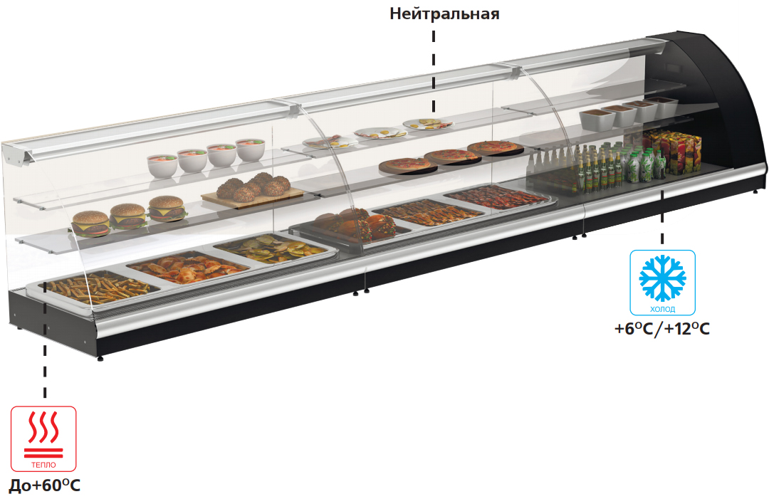 Витрина предназначена для эксплуатации в закрытом помещении с естественной вентиляцией при температуре окружающего воздуха от + 12°С до + 25°С и относительной влажности не более 60%.