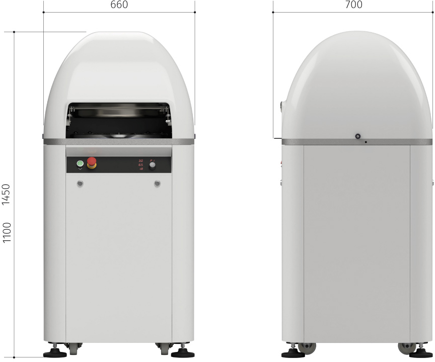 Машина с гидравлическим приводом, с двумя цилиндрами для прессования, одним цилиндром для разрезания и одним — для округления. Панель управления с возможностью регулировки времени прессования, округления и раскрытия формовочной камеры. Кнопка очистки ножей. Возможность сохранить до 9 различных программ.