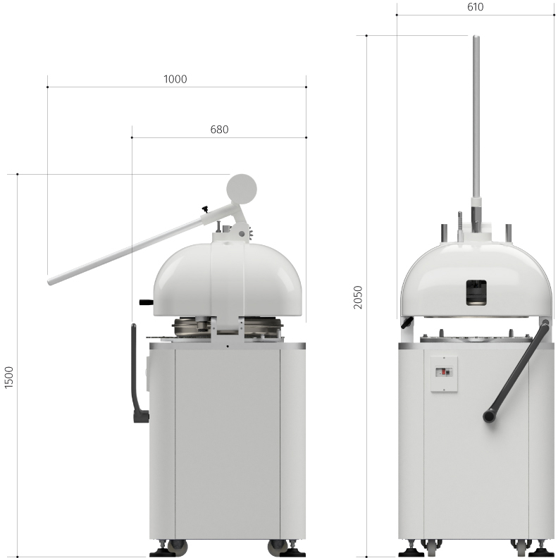 Агрегат с механическим управлением. Фазы прессования, разрезания и окончательная – сворачивание производятся при помощи рычагов, в то время как регуляция тестоформовочной камеры производится рукояткой по нумерованной шкале. Агрегат поставляется в комплекте с 3 лотками.