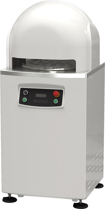 Имеет следующий принцип работы: кусок теста определенной массы кладется на специальную формовочную пластину и помещается внутрь машины, ножи делят тесто по объемному принципу на 30 частей, а вращающийся механизм придает кускам округлую форму.