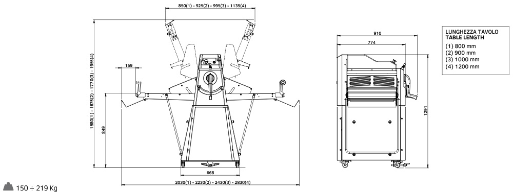 Внутри аппарата расположены друг над другом два вала, благодаря чему можно регулировать толщину раскатывания тестового пласта. Регулировка опускания цилиндров позволяет точно контролировать толщину раскатываемого тестового пласта до 40 мм. Лента размером 550x1200 мм.