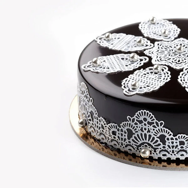 Шаблон равномерно прижимать утюжком, края можно закрепить иголками или скрепками. Когда между шаблоном и бисквитом остается пространство, глазурь и крем растекаются и делают ажур неаккуратным. Если поверхность не идеально ровная, трафарет прикладывают частями и наносят сладкую массу только на плотно прилегающий фрагмент. И таким образом фрагмент за фрагментом наносят крем или пасту на весь торт.