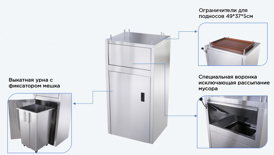 Станция сбора отходов Atesy ССО-240-П-01 предназначена для сбора одноразовой посуды и упаковки от фаст-фуда, а так же временного хранения использованных подносов в точках общественного питания и ресторанах самообслуживания.