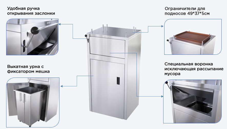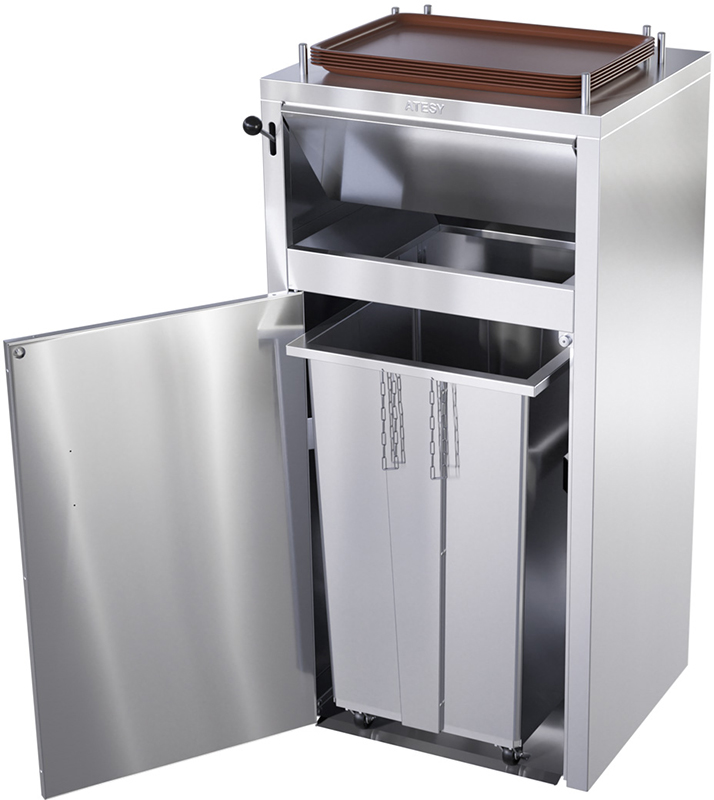 Станция сбора отходов Atesy ССО-240-Р-01 предназначена для сбора одноразовой посуды и упаковки от фаст-фуда, а так же временного хранения использованных подносов в точках общественного питания и ресторанах самообслуживания.