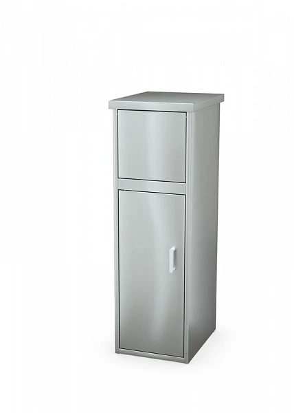 С фасадной стороны сверху расположено отверстие для сброса мусора, закрытое качающейся дверцей.