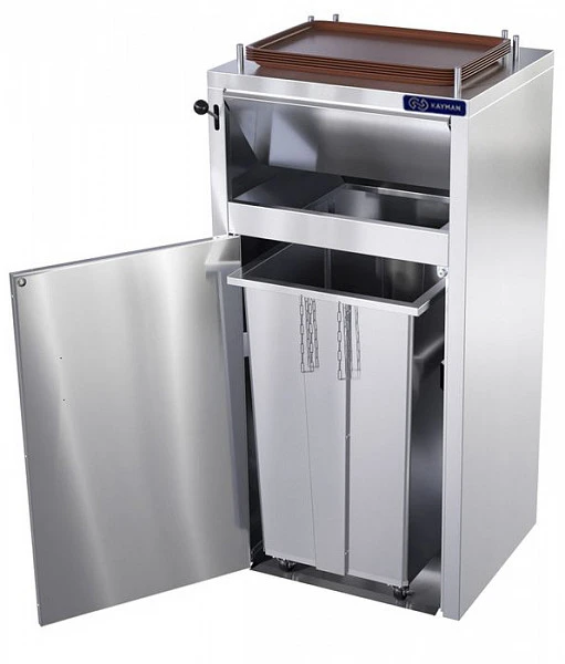Урна для фудкорта Kayman СО-124-Р А предназначена для сбора одноразовой посуды, упаковки от фаст-фуда и прочего мусора, а также для временного хранения использованных подносов в точках общественного питания и ресторанах самообслуживания. Благодаря рычагу не нужно касаться заслонки руками.