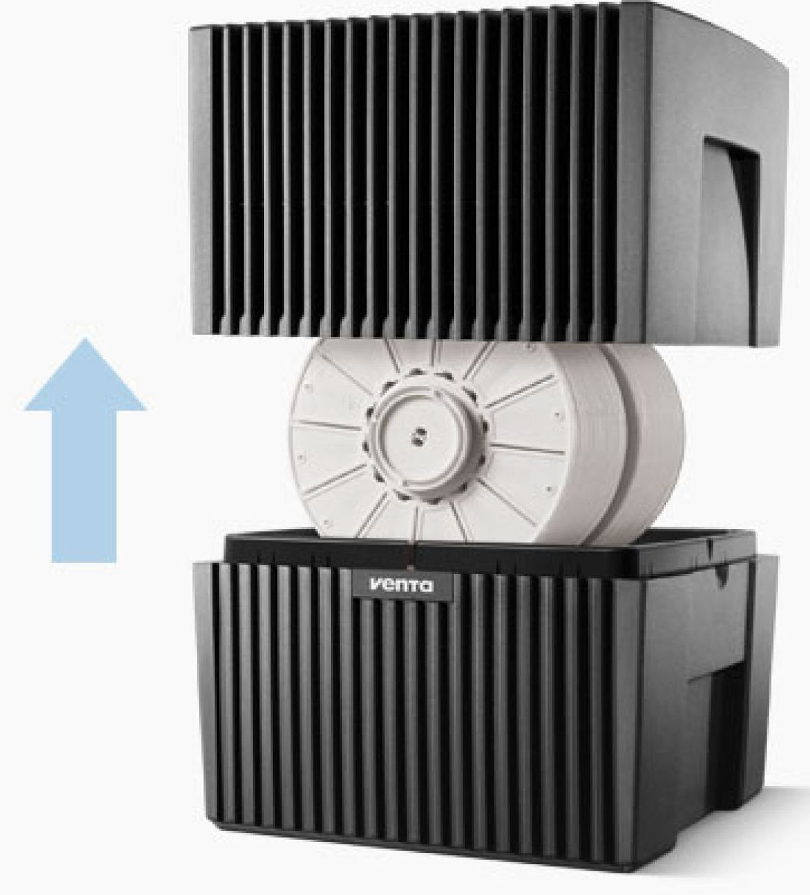 барабан. Вода испаряется с поверхности пластин барабана - комнатный воздух увлажняется благодаря принципу холодного испарения, который полностью исключает образование белого налета кальция на мебели и переувлажнение воздуха. Одновременно с этим происходит очистка воздуха. Вода задерживает даже микроскопические частицы размером до 10 мкм (10/1000мм). Мойка воздуха Venta не использует фильтры, которые по истечении времени загрязняются. Фильтром в приборах Venta выступает обыкновенная вода, каждый день свежая и день ото дня работающая с одинаково высокой эффективностью по увлажнению и очистке воздуха.