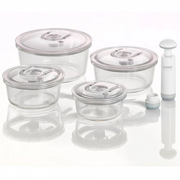 Вакуумные контейнеры Caso VacuBoxx R-set сохраняют вкус, запах и цвет продуктов. В комплект контейнеров для вакуумной упаковки входит четыре вакуумных контейнера объемом 1700, 370, 620, 940 мл, а также ручной насос. Стеклянный вакуумный контейнер высокого качества с крышкой из тритана.