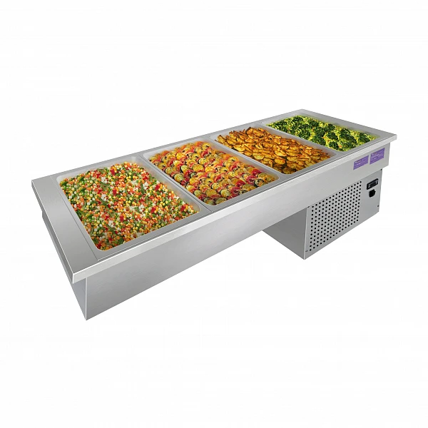 Ванна холодильная встраиваемая Finist Static gastro ВХВ-4 предназначена для демонстрации и кратковременного хранения готовых холодных блюд и салатов на предприятиях общественного питания и торговли. Модель размещается как отдельно стоящий прилавок либо монтируется в существующую линию раздачи. Модель оснащена самостоятельной холодильной установкой, кабелем питания с евровилкой и кнопочной панелью управления с цифровым дисплеем. Цельнозаливной корпус выполнен из высококачественной нержавеющей стали.