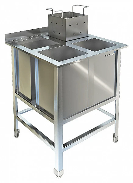 Четыре сварные емкости размером 265х265х450 из нержавеющей стали марки AISI 304 толщиной 0,8мм. Каркас сварной из уголка 40х40 толщиной 2мм. Покрытого порошковой краской серого цвета, внизу по периметру обвязка, диаметр выпуска 90 мм. Регулируемые опоры. Корзина для яиц перфорированная с 2-мя ручками из нержавеющей стали марки AISI 304. Ванна поставляется в собранном виде.