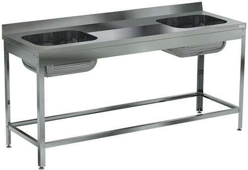 Ванна моечная цельнотянутая двухсекционная с рабочей поверхностью с бортом Кобор ВМЦР/2-210/70/430 Л/Ц/П предназначена для использования на предприятиях общественного питания для мытья кухонного инвентаря и оттайки замороженных пищевых продуктов.
