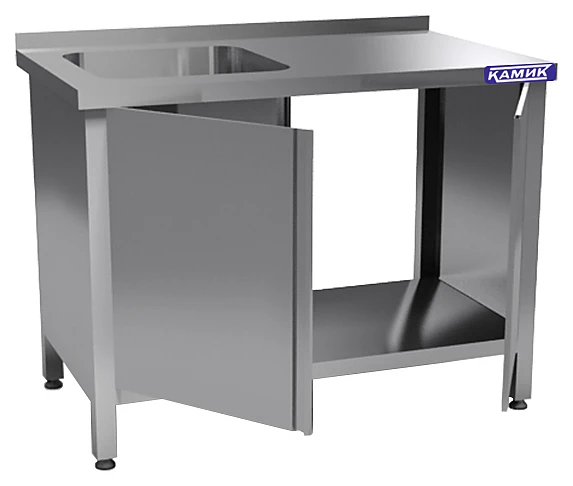 Одна емкость цельнотянутая, одинарная из нержавеющей стали AISI 304. Каркас из нержавеющей стали AISI 430. Мойка находится слева. Имеется борт. Столешница выполнена из нержавеющей стали AISI 430. Две распашные двери,крыло, полка-дно. Ванна закрыта по бокам. Задняя стенка отсутствует.