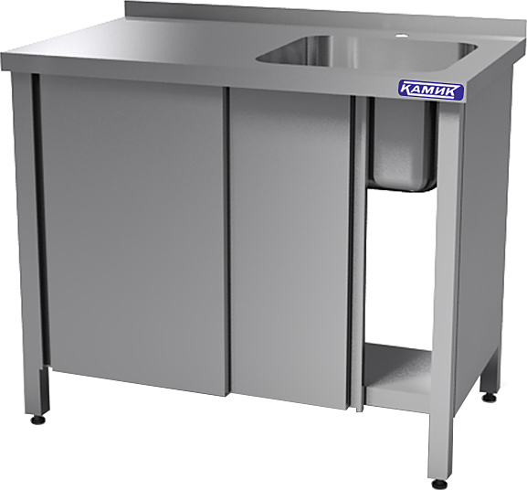 Одна емкость цельнотянутая, одинарная. Каркас из нержавеющей стали AISI 430. Мойка находится слева. Имеется борт. Столешница выполнена из нержавеющей стали AISI 430. Две двери-купе,крыло, полка-дно. Ванна закрыта по бокам. Задняя стенка отсутствует.