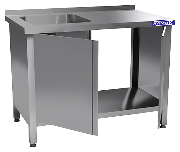 Одна емкость цельнотянутая, одинарная из нержавеющей стали AISI 304. Каркас из нержавеющей стали AISI 430. Мойка находится слева. Имеется борт. Столешница выполнена из нержавеющей стали AISI 430. Две распашные двери, полка-дно. Ванна закрыта по бокам. Задняя стенка отсутствует.