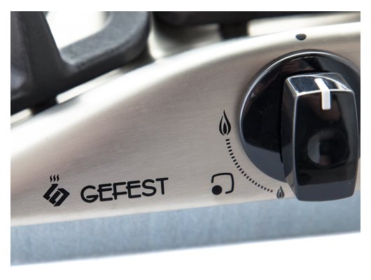При нажатии на кнопку, расположенную рядом с регуляторами варочной панели Gefest СГ СН 1210 К5, срабатывает электроподжиг газа в конфорках, которые дополнены фигурными и составными чугунными решетками. Предусмотрено фиксированное положение «малое пламя».