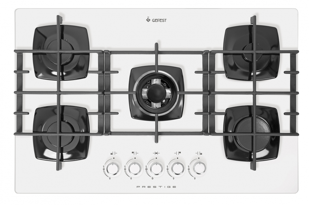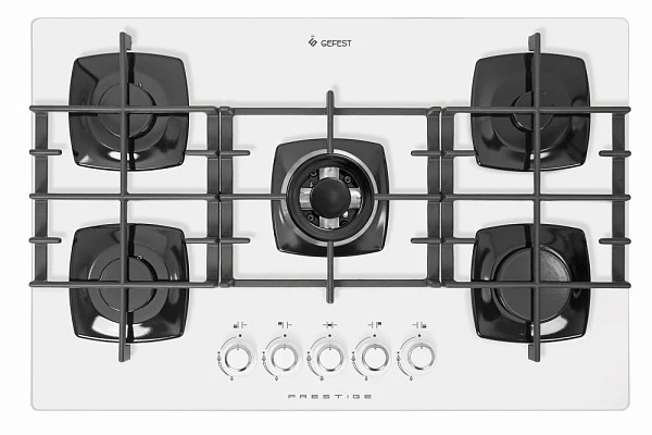 Варочная панель газовая Gefest СГ СН 2340 К12 оснащена пятью конфорками: четырьмя одноконтурными и одной трехконтурной. Они накрыты чугунными решетками, которые не гнутся под весом посуды. В поворотные переключатели встроен автоматический электроподжиг, за счет которого отпадает необходимость пользоваться спичками.