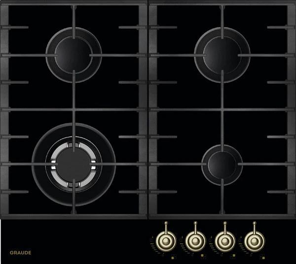 Варочная панель газовая Graude GSK 60.1 S выполнена из закаленного черного стекла. У панели традиционное для продукции Грауде строгое оформление без рамок, с решетками из черного чугуна и черными крышками конфорок. В дизайн удачно вписывается бронзовая фурнитура. Плита станет стильным предметом бытовой техники для кухни.