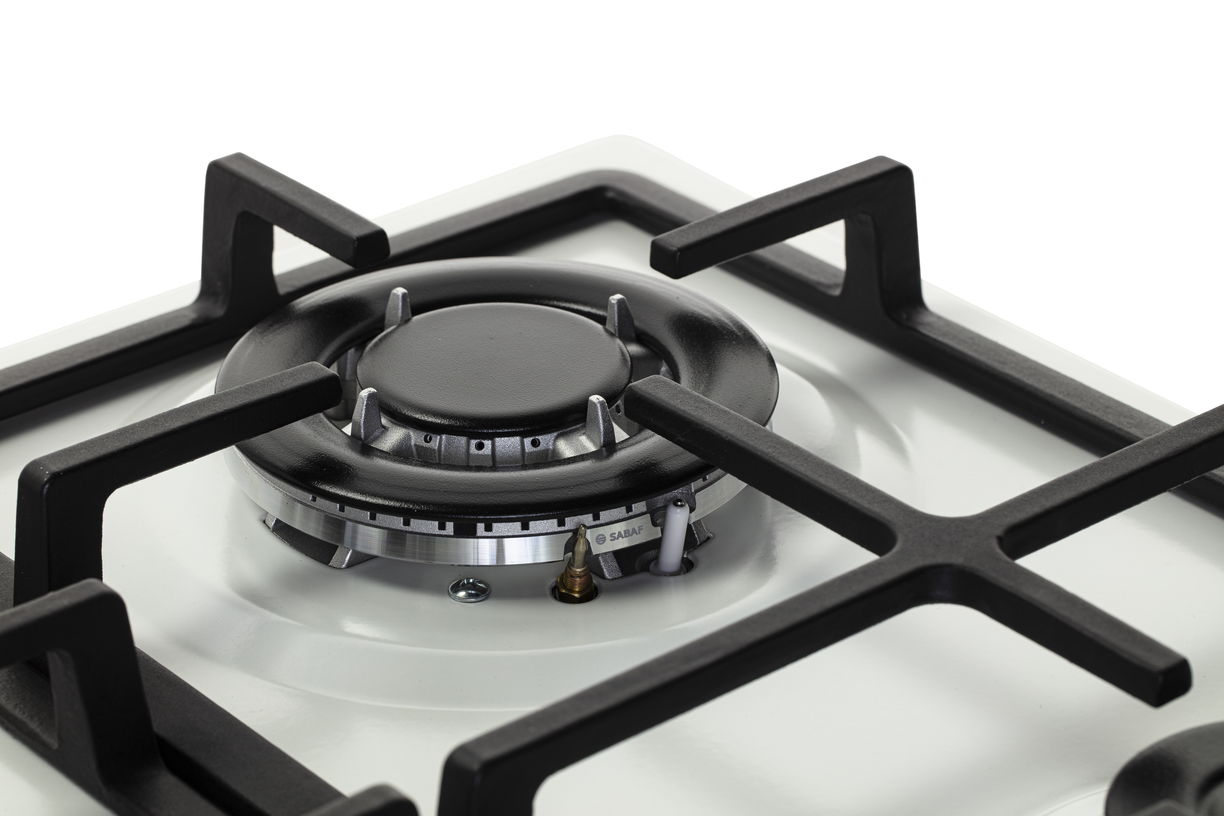 Варочная панель оборудована четырьмя конфорками с горелками SABAF — двумя стандартными, одной WOK-конфоркой для посуды с широким или выпуклым днищем и одной экономичной.