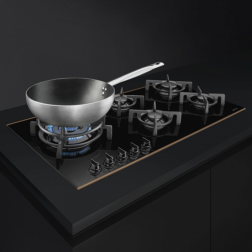 Панель Smeg PV695LCNR стеклокерамическая, а независимые чугунные решетки для каждой конфорки придают ей особенно изысканный вид. Такой прибор способен стать настоящим украшением интерьера. При этом он удобен и безопасен: в поворотные переключатели встроен автоматический электроджиг, что избавляет от необходимости использования зажигалок и спичек, а в горелки – газ-контроль, исключающий возможность отравления при случайном затухании пламени. Автоматический поджиг интегрирован в каждую ручку и активируется при ее повороте. Регуляторы занимают левое положение, что удобно при настройке работы. Плавный ход позволяет точно регулировать мощности и фиксировать нужные значения. Большая конфорка сокращает время приготовления, так как быстро доводит жидкость до кипения. Данную горелку можно также использовать для приготовления в посуде wok. Среди преимуществ: газ-контроль, WOK-конфорка, автоматический электроподжиг.