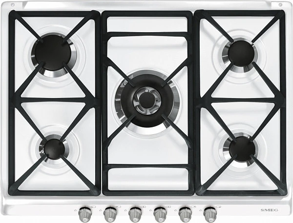 Варочная панель газовая Smeg SR775BS1 из коллекции Cortina выполнена в белом цвете. 5 газовых конфорок, в том числе одна с двойным управлением, позволяют комфортно готовить даже сложные блюда, требующие как интенсивной жарки, так и бережного тушения. Автоматический электроподжиг обеспечивает удобство эксплуатации — пламя зажигается поворотом переключателя, без спичек и зажигалок. Газ-контроль гарантирует безопасность использования.
