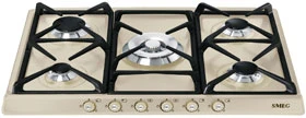 Варочная панель газовая Smeg SR775PO независимая варочная панель с эмалированной рабочей поверхностью кремового цвета. Модель снабжена прочными чугунными решетками и изящной латунной фурнитурой. Для ускоренного приготовления или подогрева пищи предусмотрена центральная конфорка типа «Двойная корона». Безопасную эксплуатацию устройства гарантирует система защиты от газовой утечки.