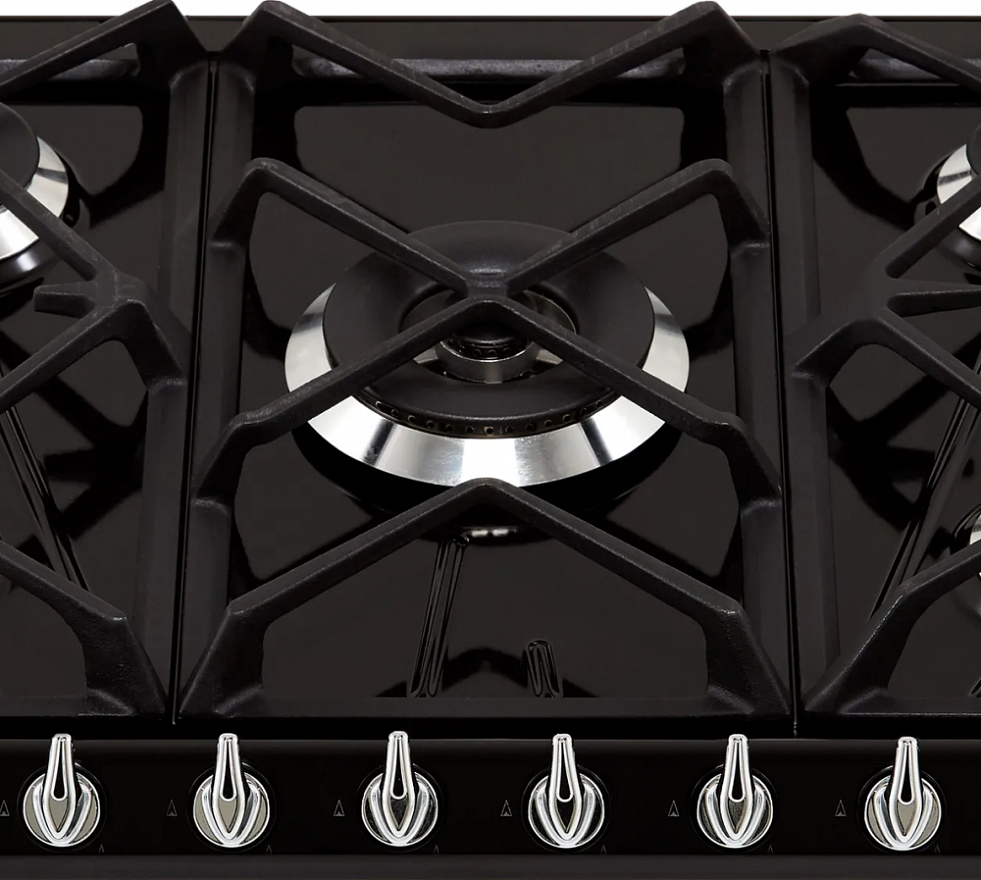 В каждую ручку интегрирован электрический поджиг. Он срабатывает при повороте ручки. Для его функционирования необходимо подключить варочную панель к электросети. Центровое расположение занимает самая большая конфорка с двумя рядами пламени, которыми можно управлять. Это удобно, так как при использовании посуды разного диаметра она не будет выходить за пределы прибора, и пламя будет концентрироваться непосредственно посередине изделия для наилучших результатов приготовления.
