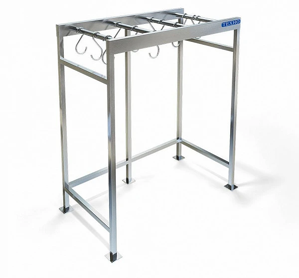 Каркас прямоугольной формы, сварной из трубы 40х40 нержавеющей стали марки AISI 304 толщиной 1,2мм. Перекладина для крюков из трубы Д 42 мм. Толщиной 3,0 мм. Подпятник 80х80 мм толщиной 2мм для крепления к полу. Стеллаж поставляется в собранном виде.
