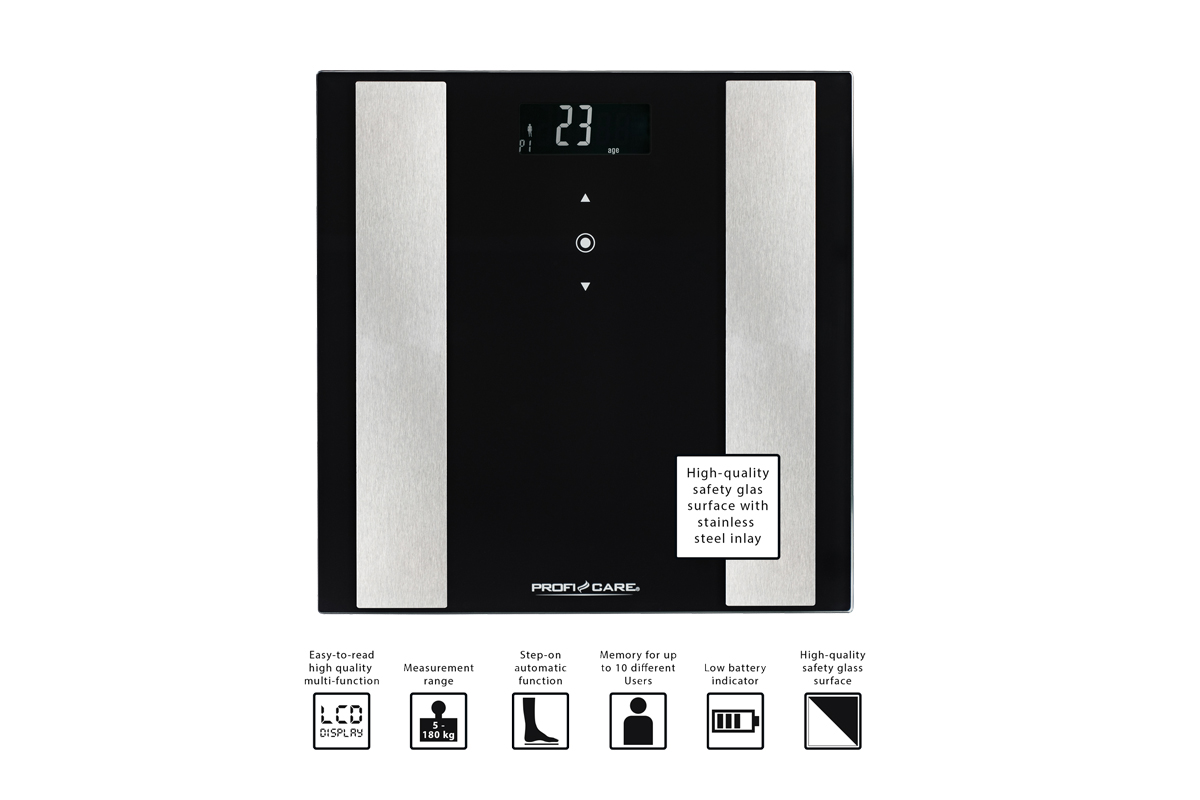 Весы напольные Profi Care PC-PW 3007 FA schwarz предназначены для анализа веса, жировой ткани, процентного содержания воды, мышечной массы, костной массы, суточной потребности в калориях, индекса массы тела и биологического возраста, внутреннего жира