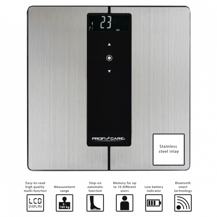 Весы напольные Profi Care PC-PW 3008 BT предназначены для анализа веса, жировой ткани, процентного содержания воды, мышечной массы, костной массы, суточной потребности в калориях, индекса массы тела и биологического возраста, внутреннего жира
