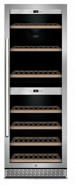 Семь съемных полок из дерева предназначены для правильного хранения вина: бутылки кладутся горизонтально (вместительность – 126 бутылок). Деревянные полки оборудованы фиксаторами от самопроизвольного выдвижения и компенсируют механические воздействия компрессора и вентилятора. Параметры холодильника задаются вручную, а также при помощи мобильного приложения «CASO-App». Возможна удаленная смена настроек из любой точки мира. Управление осуществляется при помощи двух сенсорных панелей. Регулировка температурных показателей с шагом в 1°C происходит нажатием « ∧ » и «∨».