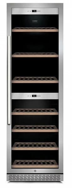 Семь съемных полок из дерева предназначены для правильного хранения вина: бутылки кладутся горизонтально (вместимость – 180 бутылок). Управление осуществляется при помощи двух сенсорных панелей с ЖК дисплеем. Регулировка температурных показателей с шагом в 1°C происходит нажатием « ∧ » и «∨». Управление внутренним освещением возможно при помощи кнопки «Свет». Встроенные светодиоды не нагреваются, и внутренний микроклимат остается максимально благоприятным для хранения бутылок. Благодаря функции WiFi Smart Control, винным шкафом можно управлять через мобильное приложение CASO-APP.