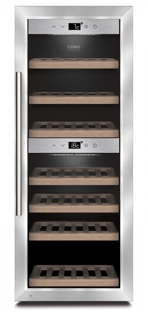 Семь съемных полок из дерева предназначены для правильного хранения вина: бутылки кладутся горизонтально (вместительность – 38 бутылок). Деревянные полки оборудованы фиксаторами от самопроизвольного выдвижения и компенсируют механические воздействия компрессора и вентилятора. Благодаря функции WiFi Smart Control, через мобильное приложение CASO-APP, можно удаленно следить за параметрами вашего винного шкафа и менять их в случае необходимости. Управление осуществляется при помощи двух сенсорных панелей. Регулировка температурных показателей с шагом в 1°C происходит нажатием « ∧ » и «∨». Управление внутренним освещением возможно при помощи кнопки «Свет». Чтобы прочитать этикетку, не нужно открывать дверь холодильника — светодиодные панели включаются кнопкой на внешней панели управления.