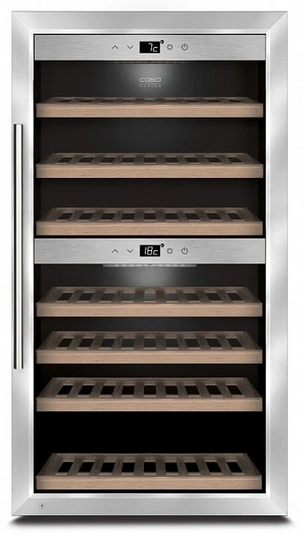 Семь съемных полок из дерева предназначены для правильного хранения вина: бутылки кладутся горизонтально (вместительность – 66 бутылок). Управление осуществляется при помощи двух сенсорных панелей внутри холодильника. Регулировка температурных показателей с шагом в 1°C происходит нажатием « ∧ » и «∨». Управление внутренним освещением возможно при помощи кнопки «Свет». Красивая подсветка силуэтов бутылок синим цветом, обеспечивается за счет светодиодных панелей. Встроенные светодиоды не нагреваются, и внутренний микроклимат остается максимально благоприятным для хранения бутылок.